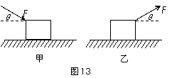 (2)如图13乙所示,若不改变力F的大小,只把力F的方向变为与水平方向成θ=37 º角斜向上的拉力,使木箱由静止开始运动,作用2.0s后撤去拉力,求撤去拉力后木箱还能运动多远。