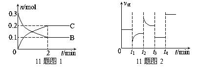 xC(g) △H<0,B、C的物质的量随时间变化的关系如图1,达平衡后在t1、t2、t3、t4时都只改变了一种条件,逆反应速率随时间变化的关系如图2。