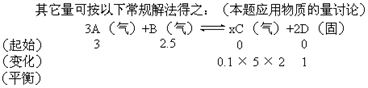 由D的变化量根据各物质的变化量和方程式系数成正比解出:x=2;B的变化量为0.5mol,进而解出B的转化率为20%;C在平衡时,其物质的量为1mol,其浓度为0.5mol·L-1。