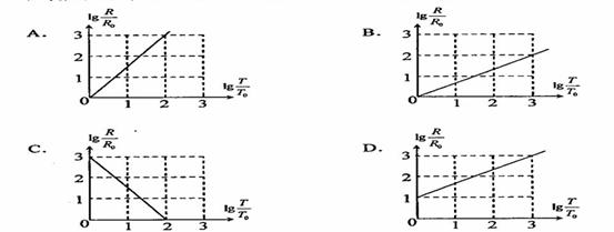 20.太阳系中的8大行星的轨道均可以通过可以近似看做圆轨道。下列4幅图是用来描述这些行星运动所遵从的某一规律的图像。图中坐标系的横轴是lg (T/T0) ,纵轴是lg(R/R0);这里T和R分别是行星绕太阳运行周期和相应的圆轨道半径,T0和R0 分别是水星绕太阳运行的周期和相应的圆轨道半径。下列4幅图中正确的是[B]
