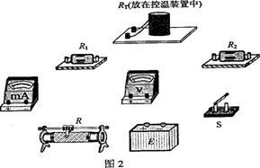 用对温度敏感的半导体材料制成的某热敏电阻R1,在给定温度范围内,其阻值随温度的变化是非线性的。某同学将R1和两个适当的固定电阻R1、R2已成图1虚线框内所示的电路,以使该电路的等效电阻R1的阻值随RT所处环境温度的变化近似为线性的,且具有合适的阻值范围。为了验证这个设计,他采用伏安法测量在不同温度下RL的阻值,测量电路如图1所示,图中的电压表内阻很大。RL的测量结果如表1所示。