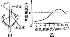 从某植物长势一致的黄化苗上切取等长幼等段(无叶和侧芽),将茎段自顶端向下对称纵切至的3/4处后,浸没在不同浓度的生长素溶液中,一般时间后,茎段的半边茎会向切西侧弯曲生长形成弯曲角度(a)如图甲,a与生长素浓度的关系如图乙。请回答: