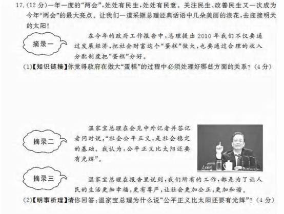 17.(12分)一年一度的“两会”,处处有民生,处处有民意。关注民生、改善民生又一次成为今年“两会”的最大亮点。让我们一道采撷总理经典话语中几朵美丽的浪花,去迎接明天的太阳!