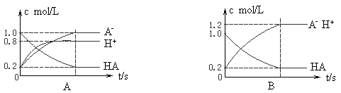 H++A-,如图将1.0 mol HA分子加入1.0 L水中,溶液中HA、H+、A-的物质的量浓度随时间而变化的曲线正确的是( )