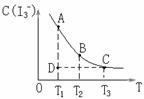 I3-(aq) △H =Q ,某I2、、KI混合溶液中,I3-的物质的量浓度c(I3-)与温度T的关系如图所示(曲线上任何一点都表示平衡状态)。下列说法正确的是