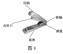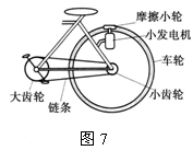 自行车后架上装有向车头灯供电的小发电机,小发电机的上端有一个摩擦小轮。行驶过程中,当需要小发电机向车头灯供电时,小轮压紧车轮,如图7所示,此时小轮在自行车车轮 力的作用下转动,发电机发电,其原理是