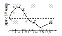 ①.BC段较AB段CO2浓度增加减慢,是因为植物开始进行光合作用消耗CO2 ; ②.CO2浓度下降从DE段开始,说明植物进行光合作用是从D点开始的; ③.H点CO2浓度最低,说明此时植物对CO2的吸收速率最大; ④.H点时,植物的叶肉细胞光合作用强度和呼吸作用强度相等