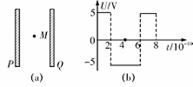 19.如图(a)所示,两个平行金属板P、Q竖直放置,两板间加上如图(b)表示的电压.t=0时,Q板比P板电势高5V,此时在两板的正中央M点有一个电子,速度为零,电子在电场力作用下运动.使得电子的位置和速度随时间变化.假设电子始终未与两板相碰,在0<t<8×10-10s的时间内,这个电子处于M点的右侧,速度方向向左且大小逐渐减小的时间是( )