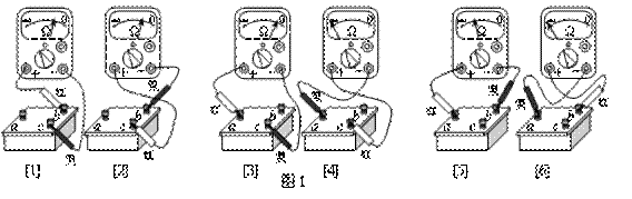 第二步:用电阻×100Ω挡,对任意两个接线柱正、反向测量,指针偏转情况如图1所示。
