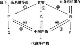 右图是幼年儿童体内物质代谢的部分过程示意图。“→”表示物质分解或合成等化学变化过程。下列关于该图的叙述中不正确的是
