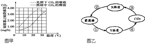 下图甲、乙表示某高等植物体内的光合作用与呼吸作用过程及其与温度的关系,有关叙述正确的是