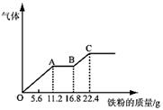 mL,平均分成两份。向其中一份中逐渐加入铜粉,最多能溶解19.2 g(已知硝酸只被还原为NO气体)。向另一份中逐渐加入铁粉,产生气体的量随铁粉质量增加的变化如下图所示。下列分析或结果错误的是