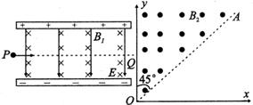 25.(21分)如图所示的平行板器件中,存在相互垂直的匀强磁场和匀强电场,磁场的磁感应强度B1=0.4T,方向垂直纸面向里,电场强度E=2.0×105V/m,PQ为板间中线。紧靠平行板右侧边缘的xOy坐标系的第一象限内,有垂直纸面向外的匀强磁场,磁感应强度B2=0.25T,磁场边界AO和y轴的夹角