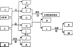 26.(19分)已知D、M、H是常见的非金属单质,其中M是无色气体,H是有色气体,J是一种金属单质(其同族的某种元素是形成化合物种类最多的元素),A、C是金属氧化物,C和J均是某种常见电池的电极材料,J元素的+2价化合物比+4价化合物稳定,B与C反应时,每生成1 mol H同时消耗4 mol B和1 mol C,K只知含有CO或CO2中的一种或两种。它们关系如图: