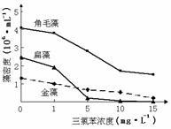 39.(6分)在我国很多地区的土壤和水体中分布着高浓度的有机污染物--三氯苯(TCB),为探究TCB对生物体的毒性效应,研究人员配制了5组培养液对金藻、角毛藻和扁藻3种单细胞微藻进行独立培养实验,结果如左下图所示。请回答下列问题: