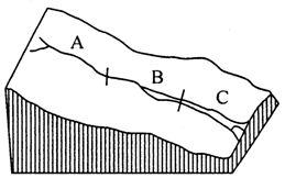 读图(图中A、B、C分别表示河流的上、中、下游)完成14-16题。
