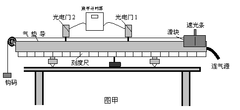 ①由图甲中刻度尺读出两个光电门中心之间的距离s=24cm,由图乙中游标卡尺测得遮光条的宽度d= cm。该实验小组在做实验时,将滑块从图甲所示位置由静止释放,由数字计时器可以读出遮光条通过光电门1的时间Δt1,遮光条通过光电门2的时间Δt2,则滑块经过光电门1时的瞬时速度的表达式v1=