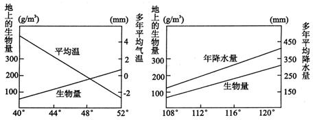 生物量一般是指生物在某一特定时刻单位空间的个体数、重量或其含能量。下图示意我国某区域地上生物量、年均温和年降水量随经纬度的线性变化。读图回答5-6题。