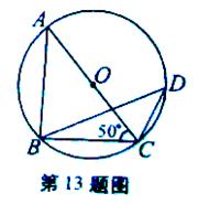 13. 如图,△ABC内接于⊙O,AC是⊙O的直径,∠ACB=500,点D是BAC上一点,则∠D=_______________![]()