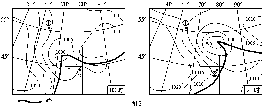 图3是某日08时和20时海平面气压分布图(单位:百帕)。读图,完成第6题。