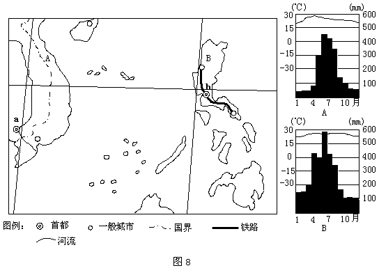 (1)比较A、B两地的气候特征差异及原因。(10分)