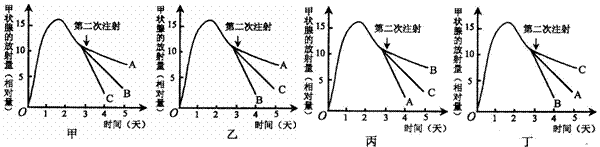 (3)若分别用A、B、C三条曲线代表A、B、C三组兔子的甲状腺中碘的放射量,则预计 A、B、C三组兔子的甲状腺中碘的放射量应如下图中的 。