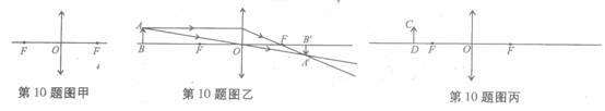 10.凸透镜成像规律可以通过画光路图去理解。在光路图中凸透镜用图甲表示,O点为光心,F为其焦点。图乙是运用经过凸透镜的两条特殊光线,所画物体AB 经凸透镜成的像A'B'的光路图。请参照图乙,在图丙中画出物体CD 经过凸透镜所成的像C'D'的光路图。