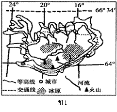 冰岛是北大西洋中部的一个岛国, 境内有火山200至300座。冰岛几乎整个国家都建立在火山岩石上,所以被称为“极圈火岛”。北京时间2010年4月14日凌晨9时,位于冰岛南部亚菲亚德拉冰盖的艾雅法拉火山喷发,火山喷发的火山灰已对欧洲环境造成重大影响,引起世界关注。读图1,完成3-4题