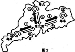 图中箭头分别表示“珠三角地区产业转移”、“当地农业劳动力向第二第三产业转移”、“较高素质劳动力转移”的是
