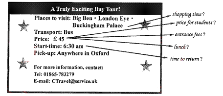 假定你是李华,正是英国牛津参加短期语言培训,计划星期天去伦敦旅游。互联网上一则广告引起了你的注意,但一些具体信息不明确(箭头所指内容)。请给该旅行社发一封电子邮件,询问有关情况。