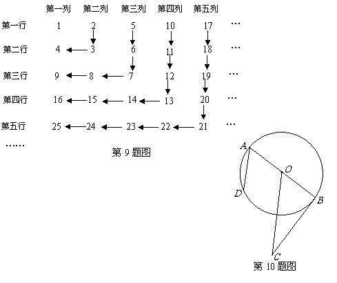9.正整数按如图所示的规律排列.则第10行,第11列的数字是