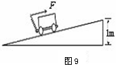 要把木箱拉到斜面顶端,小明想办法把木箱放在小车上,用沿斜面方向的轻质细绳把车和木箱匀速拉上斜面顶端(如右图9所示),整个过程历时10s。已知木箱重G=400N,车重80N,对车的拉力F=125N,斜面长L=4m,斜面高h=1m,则对木箱做的有用功是