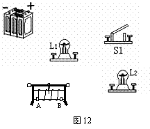 19.图12所示,现有一个电池组、滑动变阻器、开关(总开关)和两盏电灯,请你连接好符合下面要求的电路:L1的亮度不变,L2的亮度可调节。