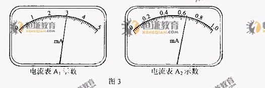 (4)若测量时,A1未调到满偏,两电流表的示数如图3所示,从图中读出A1的示数I1= ,A2的示数I2= ;由读出的数据计算得Im= 。(保留3位有效数字)