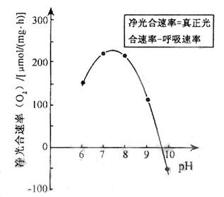 将生长旺盛的甲藻等量分成5组培养,各组藻液pH分别设定为6.0、7.0、8.0、9.O、10.0,在黑暗中放置12 h,然后在适宜光照等相同条件下培养,随即多次涮定各组氧气释放量并计算净光合速率。将实验结果绘制成右图。