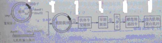 I(1)据图,仅将人乳铁蛋白基因切割出来,需要在人乳铁蛋白基因的左侧用BanHI切割,右侧用HindIII切割。当人乳铁蛋白基因和质粒连接成重组质粒后,TETR基因被人乳铁蛋白基因隔开,不是完整的,而anpR基因是完整的,所以筛选含有重组载体的大肠肝菌首先需要字含氨苄青霉素的培养基上进行。