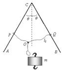 如图所示,ACB是一光滑的、足够长的、固定在竖直平面内的“∧”形框架,其中CA、CB边与竖直方向的夹角均为θ.P、Q两个轻质小环分别套在CA、CB上,两根细绳的一端分别系在P、Q环上,另一端和一绳套系在一起,结点为O.OP、OQ两根细绳的长度分别用