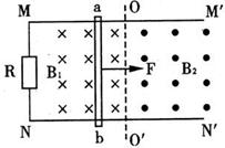 如图所示,水平放置的光滑金属长导轨MM'和NN'之间接有电阻R,导轨平面在直线OO'左、右两侧的区域分别处在方向相反与轨道平面垂直的匀强磁场中,设左、右区域的磁场的磁感强度的大小分别为B1和B2,一根金属棒ab垂直放在导轨上并与导轨接触良好,棒和导轨的电阻均不计.金属棒ab始终在水平向右的恒定拉力F的作用下,在左边区域中恰好以速度