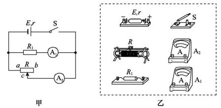 (10分)图甲是利用两个电流表A1和A2测量干电池电动势E和内阻r的电路原理图.图中s为开关,R 为滑动变阻器,固定电阻R