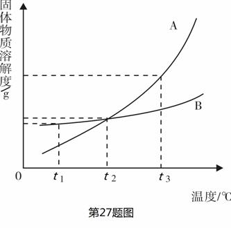 27.(3分)下图是A、B两种物质的溶解度曲线。根据图示回答下列问题。