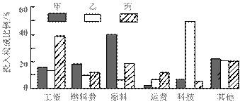 下图中甲、乙、丙反映了三类工厂的投入构成情况,读图回答1-3题。