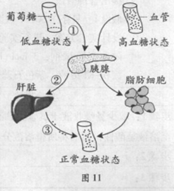 血糖平衡对机体生命活动具有重要作用。图11是血糖调控模式图,据图回答: