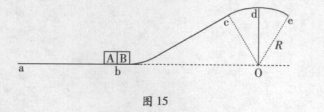 如图15所示,一条轨道固定在竖直平面内,粗糙的ab段水平,bcde段光滑,cde段是以O为圆心、R为半径的一小段圆弧。可视为质点的物块A和B紧靠在一起,静止于b处,A的质量是B的3倍。两物体在足够大的内力作用下突然分离,分别向左、右始终沿轨道运动。B到b点时速度沿水平方向,此时轨道对B的支持力大小等于B所受重力的