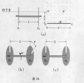 (2) 若两狭缝夹角为 ,盘匀速转动,转动方向如图16(b).要使穿过N1、N2的粒子均打到感光板P1、P2连线上,试分析盘转动角速度 的取值范围(设通过N1的所有粒子在盘转一圈的时间内都能到达N2)。