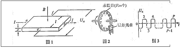 (3) 图2是霍尔测速仪的示意图,将非磁性圆盘固定在转轴上,圆盘的周边等距离地嵌装着m个永磁体,相邻永磁体的极性相反。霍尔元件置于被测圆盘的边缘附近。当圆盘匀速转动时,霍尔元件输出的电压脉冲信号图像如图3所示。