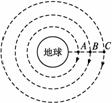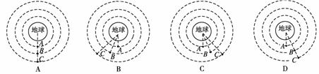 三颗人造地球卫星A、B、C在同一平面内沿不同的轨道绕地球做匀速圆周运动,且绕行方向相同,已知RA<RB<RC.若在某一时刻,它们正好运行到同一条直线上,如图4-4-4所示.那么再经过卫星A的四分之一周期时,卫星A、B、C的位置可能是( )