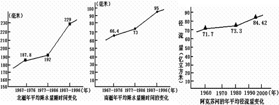 材料二 北疆和南疆年平均降水量的变化情况及阿克苏河(塔里木河的主源)年平均径流量的变化情况图。