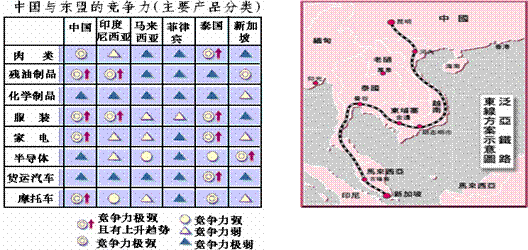 材料二 中国与东盟主要产品竞争力 材料三 泛亚铁路东线方案示意图
