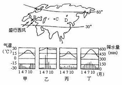 1.读“亚欧大陆轮廓图”,对照四幅气候类型的“气温和降水量月份分配图”,回答下列问题:(16分)