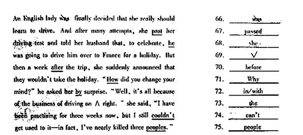 [解析]此大题难度适中,有不错的区分度。但有的语法类的错误偏多。分别考查了时态语态(2)、介词(3)、代词逻辑、连词、冠词、名词。比例为7111。其中71-74题稍有难度。 ![]()